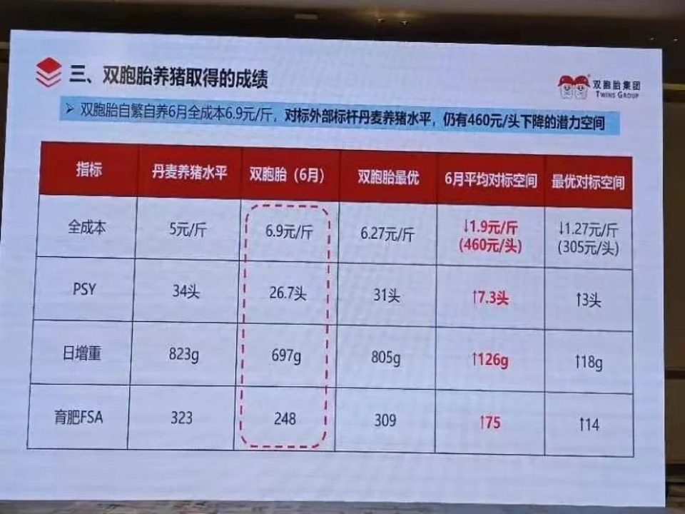 在刚结束的2024畜牧业高质量发展大会上,双胞胎也在讲课中透露,6月自繁自养全成本已经实现6.9元,最优更是可达6.27元/斤!