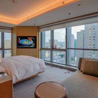 这次入住的是1628的套房,可以180度俯瞰城市的景观,房间整体是我喜欢的原木风格,特别宽敞,入住期间每天都是蓝天白云的大好天儿,躺着就能看一场窗外的日出,酒店客房还贴心的准备了欢迎水果和本地特色口味点心。白天探索龙城的有趣玩儿法,夜晚在城市高空中这方安逸空间里享有一驰的放松,JW给这座城市增添了不少的魅力。有行政礼遇的住客也能在21层的行政酒廊享受专属的空间。