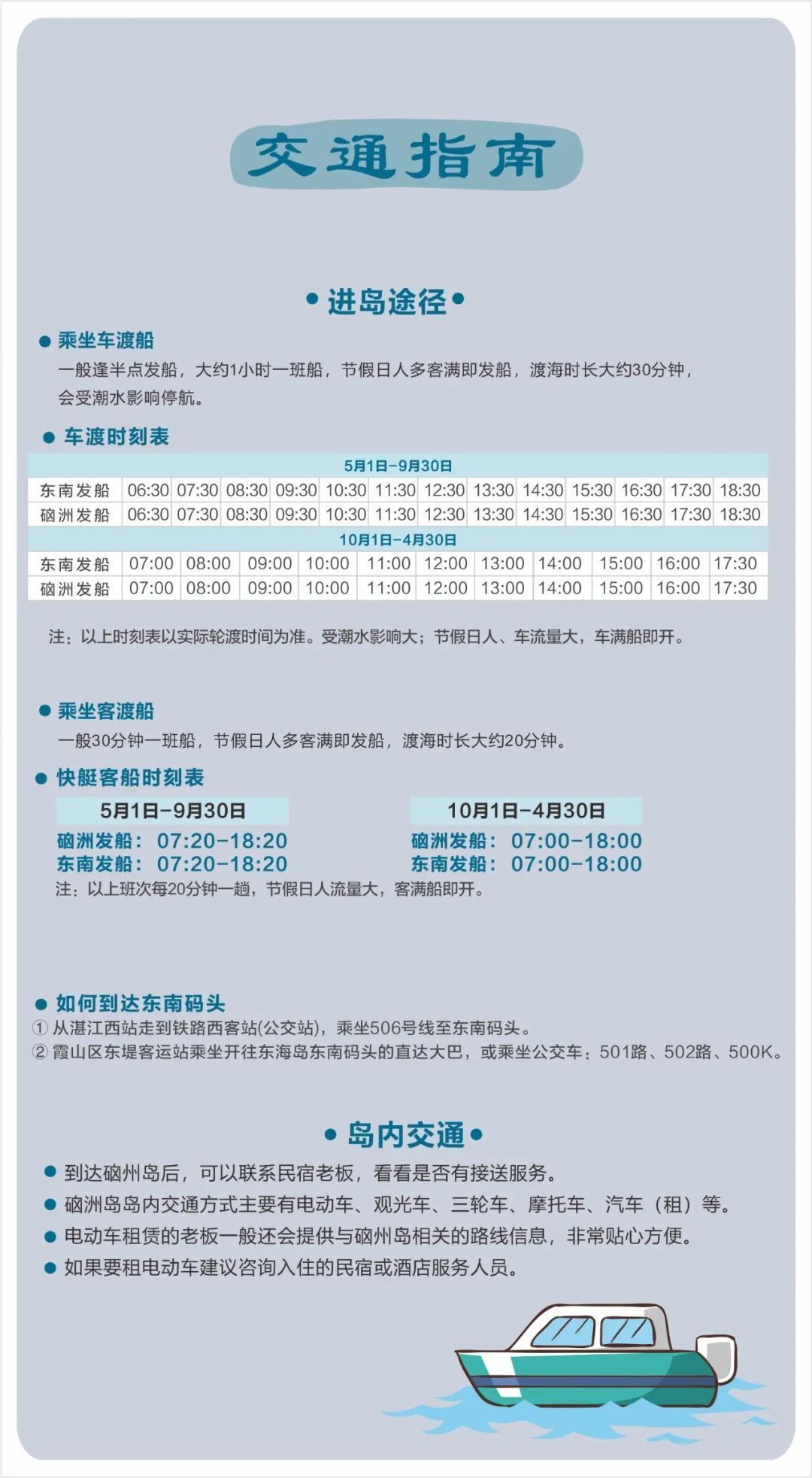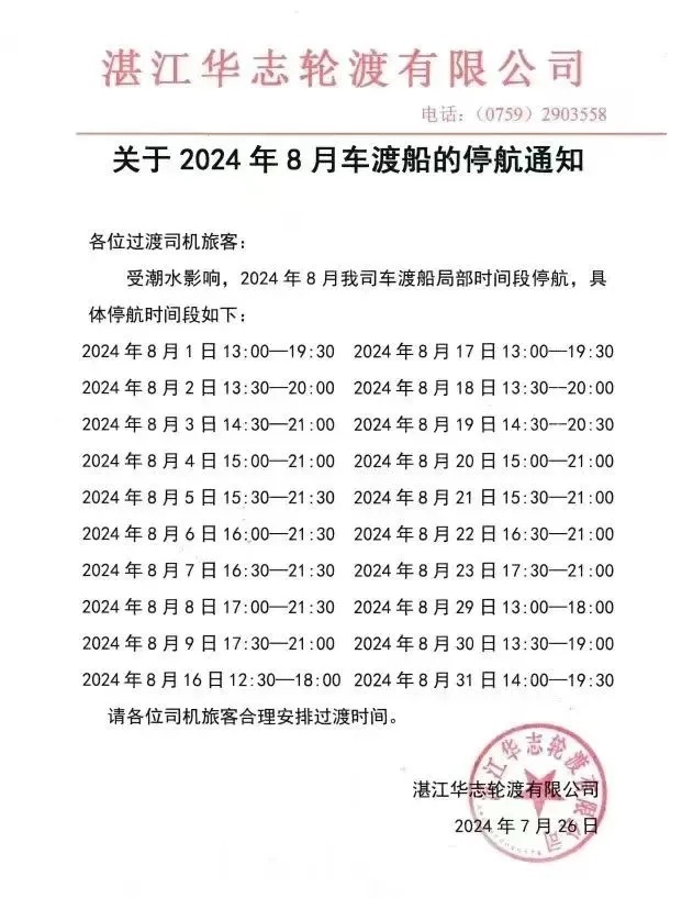 根据2024年8月份东南码头——硇洲码头车渡船的停航时间,湛江经济技术开发区旅游局提醒,请各位往返硇洲岛的游客朋友们合理安排行程,非必要无需开车入岛,避免出现车辆滞留、候船拥挤等情况。